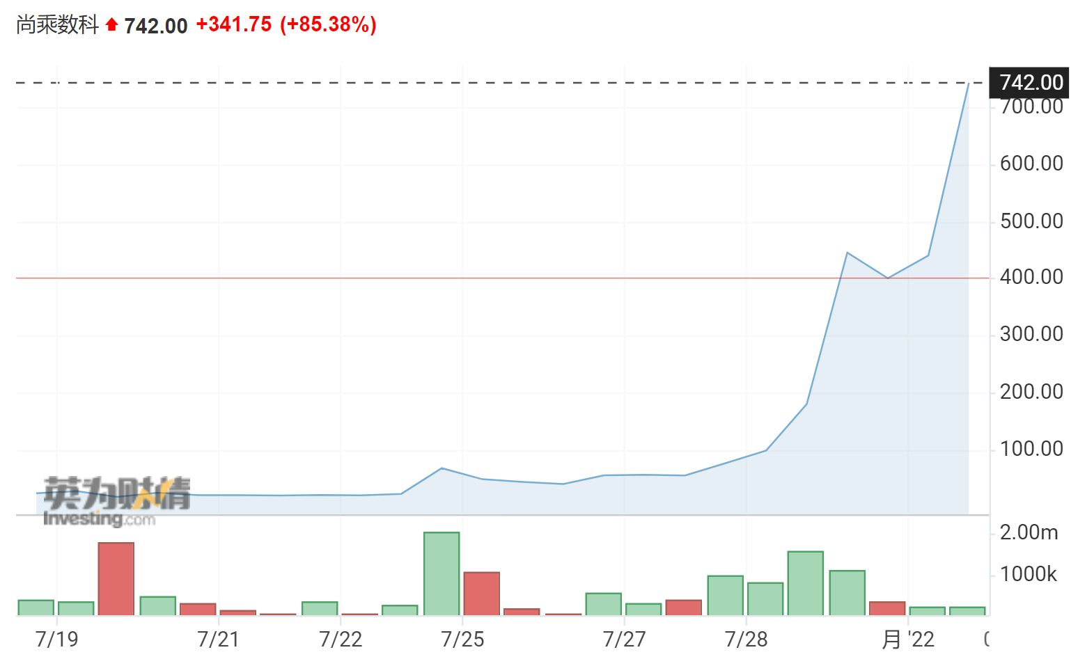 截至8月1日收盘,尚乘数科股价已飙升至742美元。这意味着,自上市以来的短短12个交易日内,该公司股价已经上涨近100倍,市盈率超6000倍,市值达1373亿美元,相当于2个拼多多(PDD,股价47.69美元,市值603亿美元),直追中概股中市值最高的台积电与阿里巴巴。