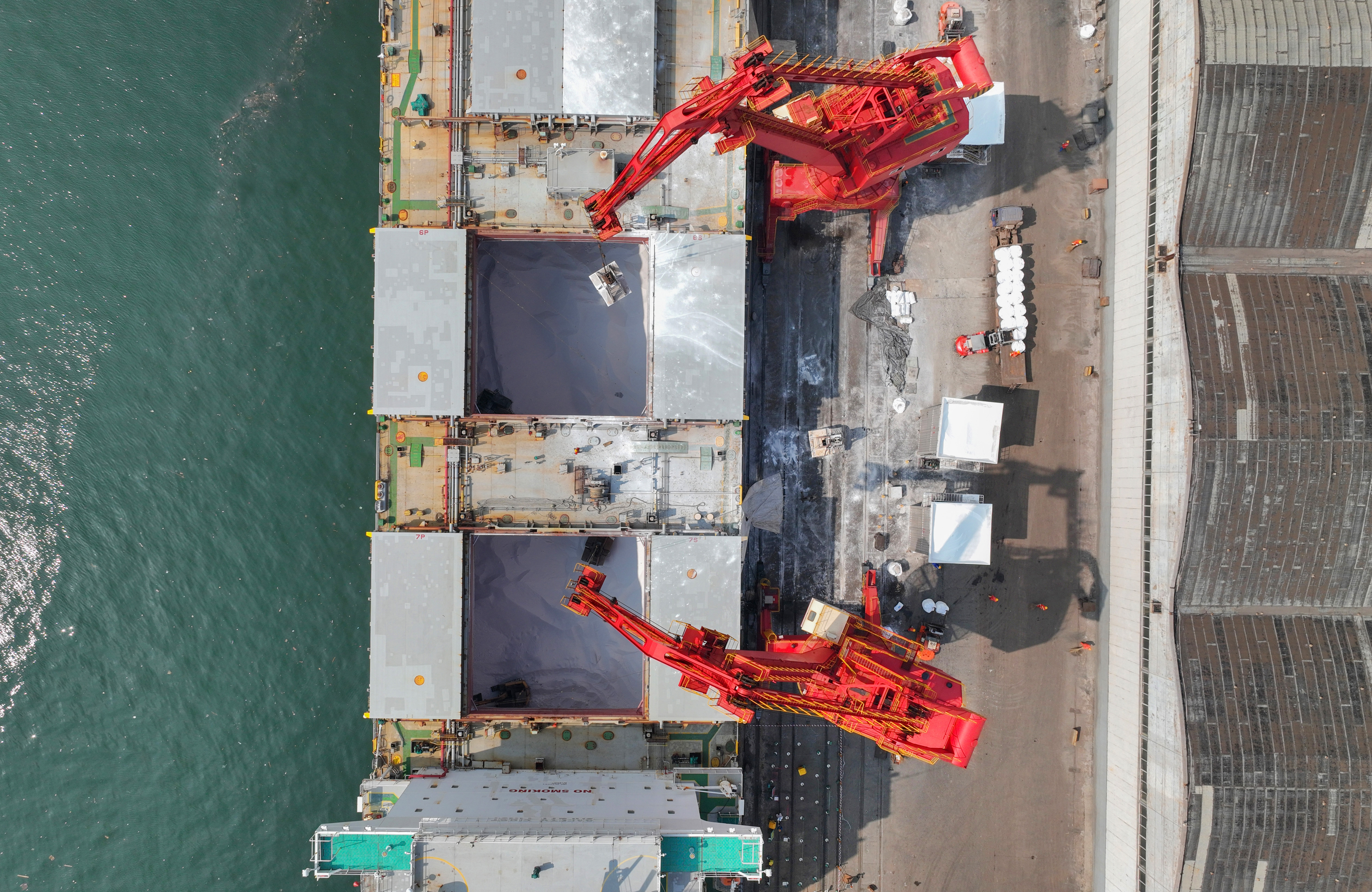 8月2日,港口东方公司码头,一艘大型船舶正在卸载进口化肥。