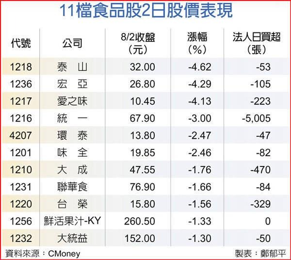 重大利空之下,不少暂停进口名单上的台企股价下挫。其中,泰山4%领跌,统一、味全、爱之味、大成等企业的跌幅也大多超过2%。