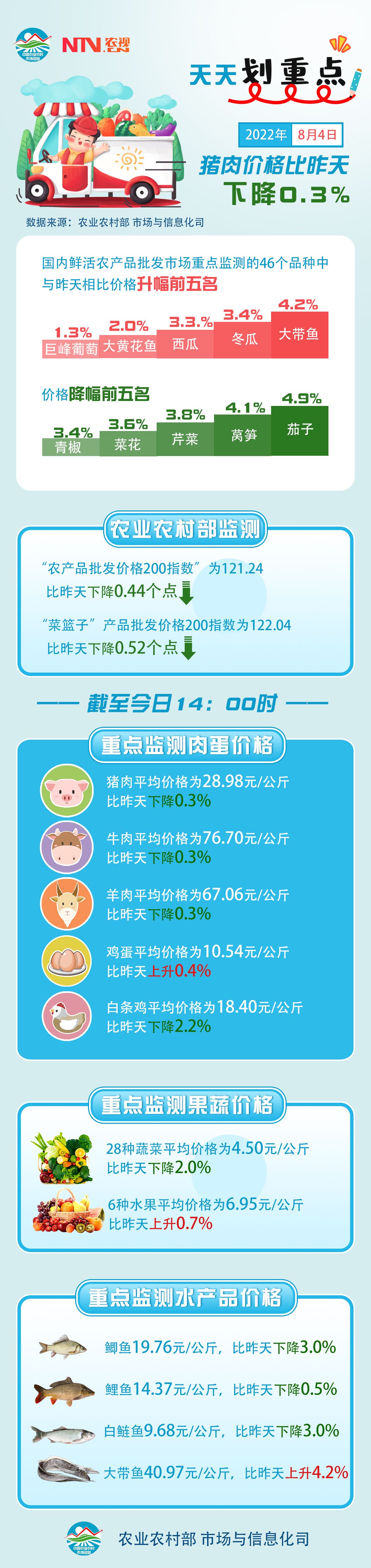 据农业农村部监测,8月4日"农产品批发价格200指数"为121.24,比昨天下降0.44个点,“菜篮子”产品批发价格指数为122.04,比昨天下降0.52个点。截至今日14:00时,全国农产品批发市场猪肉平均价格为28.98元/公斤,比昨天下降0.3%;牛肉76.70元/公斤,比昨天下降0.3%;羊肉67.06元/公斤,比昨天下降0.3%;鸡蛋10.54元/公斤,比昨天上升0.4%;白条鸡18.40元/公斤,比昨天下降2.2%。重点监测的28种蔬菜平均价格为4.50元/公斤,比昨天下降2.0%;重点监测的6种水果平均价格为6.95元/公斤,比昨天上升0.7%。鲫鱼19.76元/公斤,比昨天下降3.0%;鲤鱼14.37元/公斤,比昨天下降0.5%;白鲢鱼9.68元/公斤,比昨天下降3.0%;大带鱼40.97元/公斤,比昨天上升4.2%。