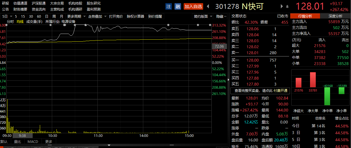 今日上市的新股快可电子可谓今天A股市场的明星,今日该股以158%的涨幅开盘。在这样的高基数下,该股在今天上午就实现了两次临停,最高涨幅还一度超过了300%。即便午盘有所回落,也依然凭借着上市首日267.4%的涨幅成为今年来上市首日涨幅最大的新股。