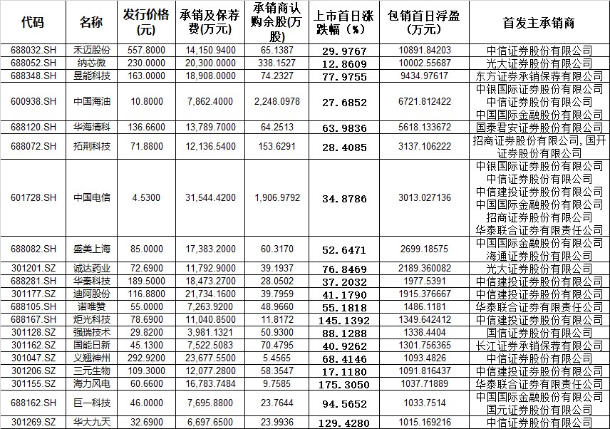 另外,以上市首日收盘价计算,最近一年内上市的新股已累计为余股包销券商带来了6.5亿的首日盈利。其中,禾迈股份、纳芯微在市首日就分别为保荐机构(主承销商)中信证券、光大证券带来了过亿的余股包销浮盈。
