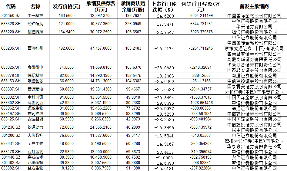 最近一年内券商余股包销上市首日浮亏排名前20的新股