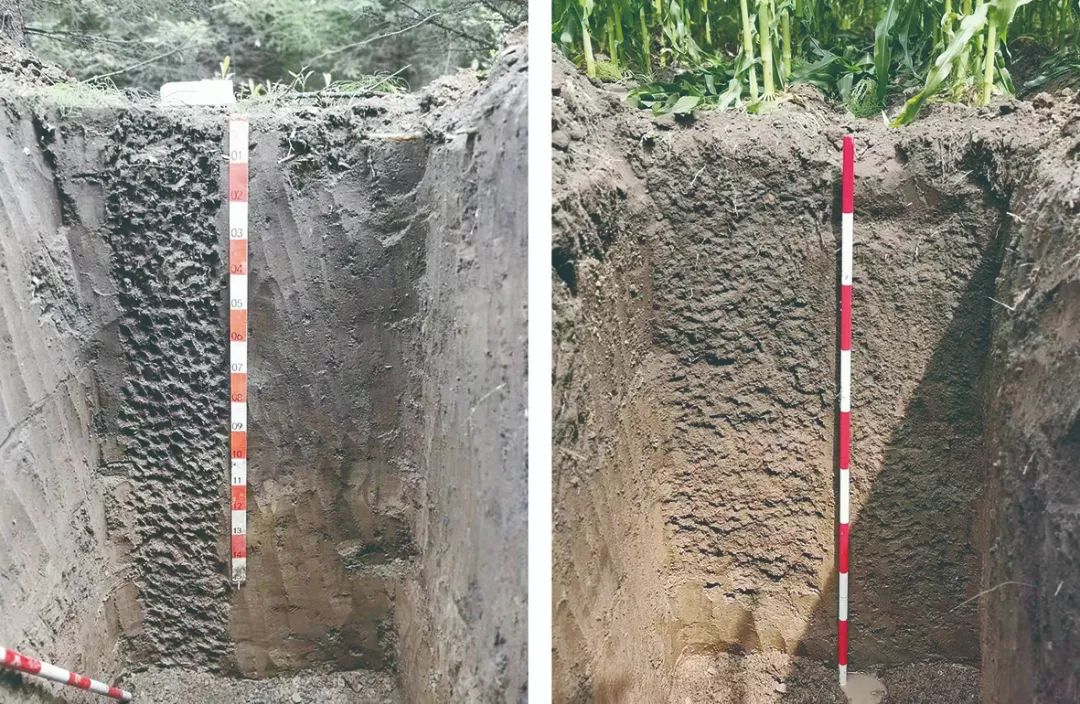 相距100米的两个剖面(平地)。左图为退耕还林的黑土层105厘米;右图为长期种植农作物黑土层85厘米。 张斌供图