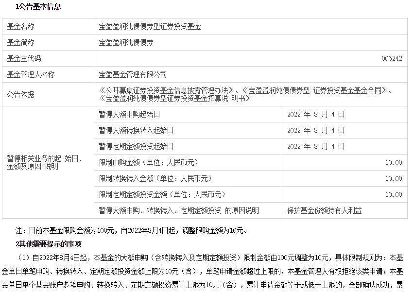 公告显示,自2022年8月4日起,本基金的大额申购限制金额由100元调整为10元。对于暂停大额申购的原因,公告指出是为“保护基金份额持有人利益”。