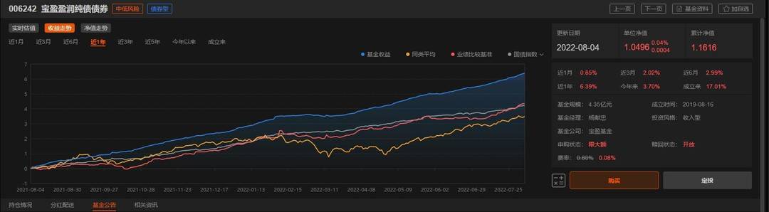 数据显示,这只中长期纯债型基金成立于2019年8月16日,截至8月4日,成立以来的收益达到17.01%,年内收益率为3.70%,同期中长期纯债基金平均收益2.14%。从收益率排名来看,成立后全年收益率在同类基金中均比较靠前,今年更是进入到同类前20。