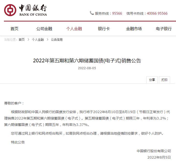 8月5日,中国银行官网发布“2022年第五期和第六期储蓄国债(电子式)销售公告”。