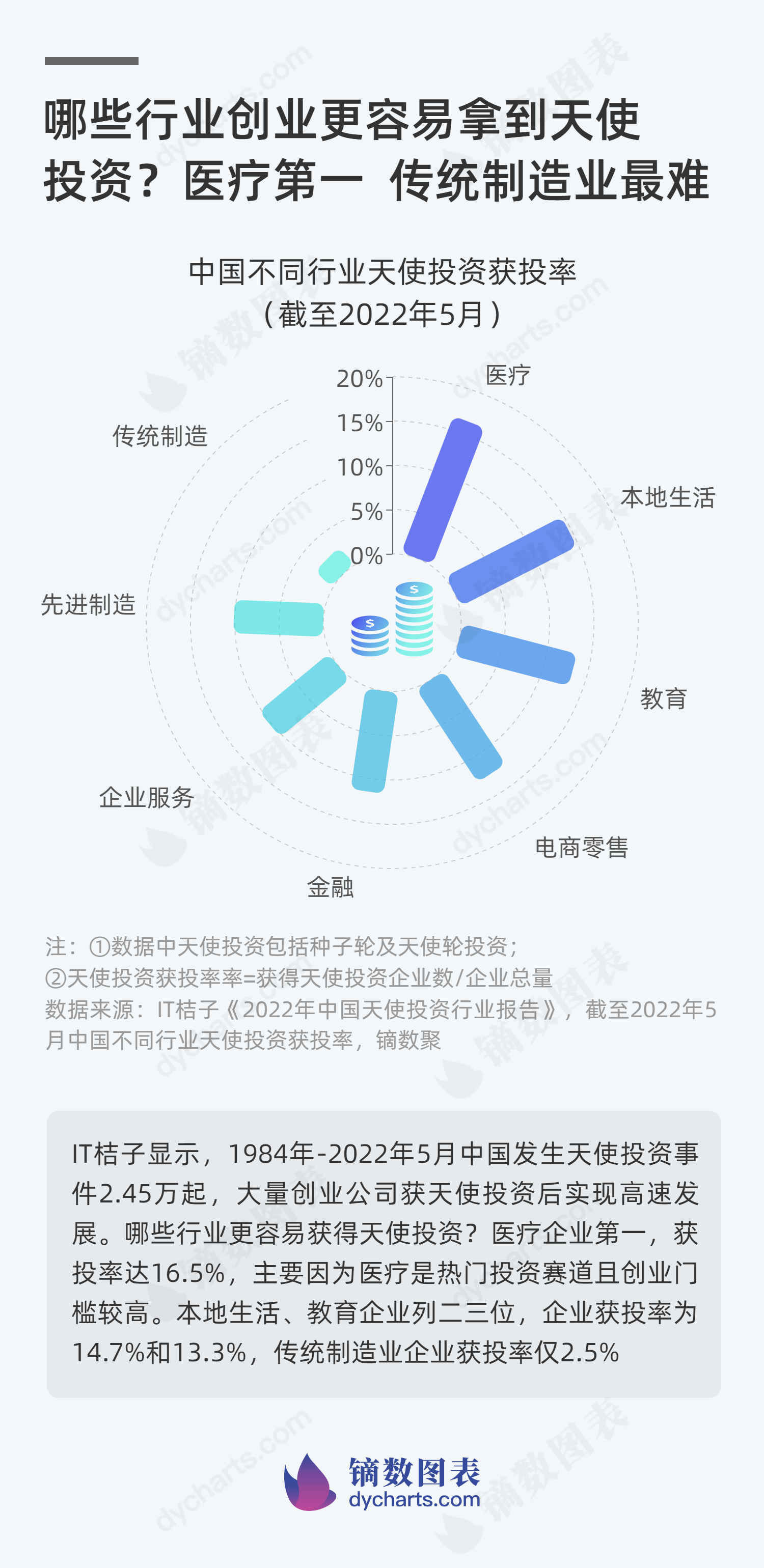 IT桔子显示,1984年-2022年5月中国发生天使投资事件2.45万起,大量创业公司获天使投资后实现高速发展。哪些行业更容易获得天使投资?医疗企业第一,获投率达16.5%,主要因为医疗是热门投资赛道且创业门槛较高。本地生活、教育企业列二三位,企业获投率为14.7%和13.3%,传统制造业企业获投率仅2.5%。