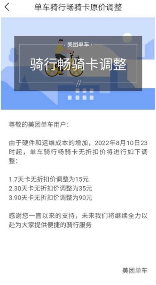 美团单车8月5日发布公告,由于硬件和维护成本的增加,从2022年8月10日23时起,将对骑行畅骑卡价格进行调整。