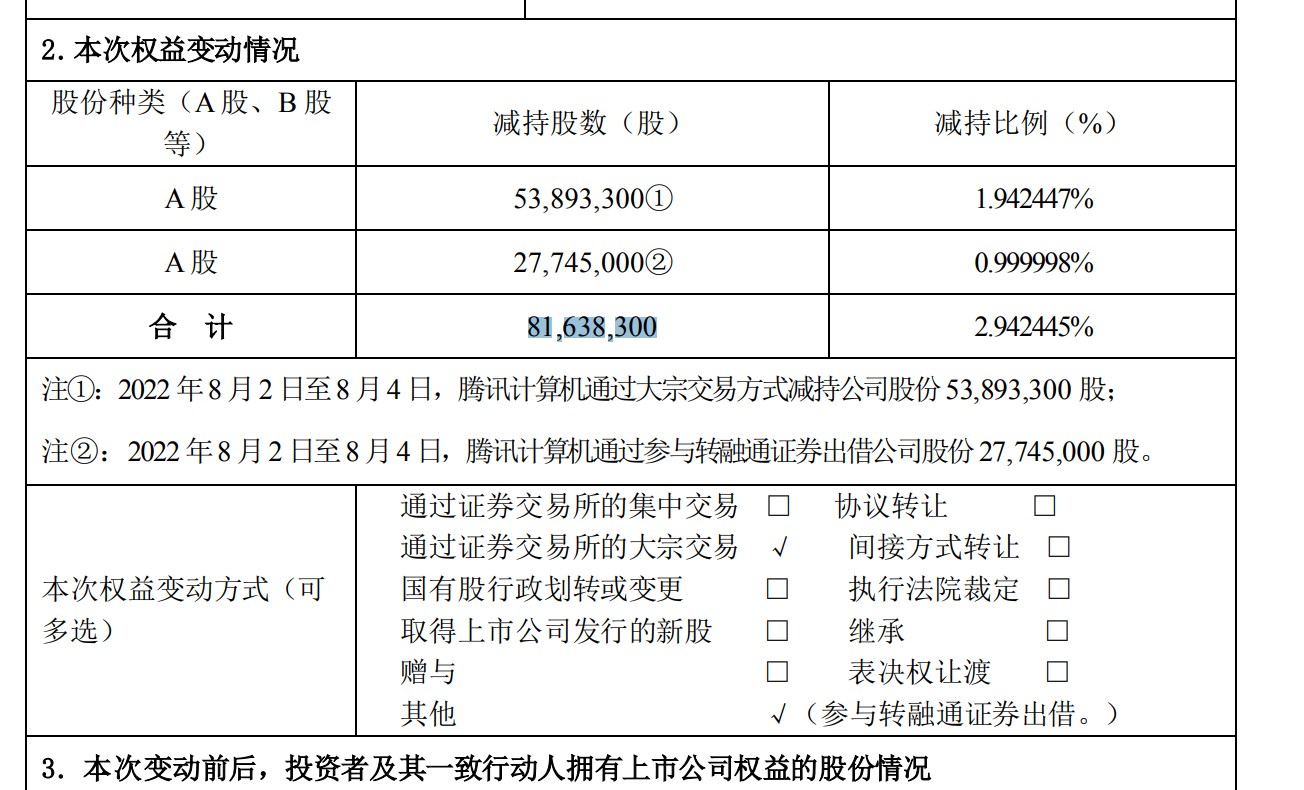 8月5日晚间,华谊兄弟发布公告,第二大股东腾讯计算机自2022年8月2日至8月4日累计通过大宗交易方式和参与转融通证券出借导致持股比例变动超1%,持股比例由7.942441%下降至4.999997%。