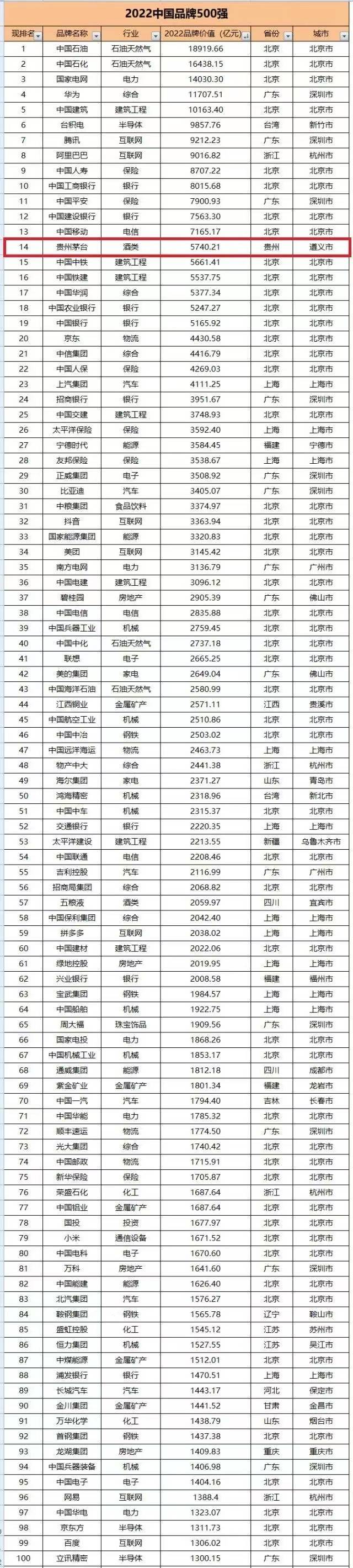 品牌联盟每年发布的中国品牌500强榜单是国内具有较强影响力的影响榜单。2022中国品牌500强中,中国石油、中国石化、国家电网排名前三,第四至第13位分别是华为、中国建筑、台积电、腾讯、阿里巴巴、中国人寿、中国工商银行、中国平安、中国建设银行、中国移动。 在2022中国品牌前50强中,茅台是唯一一家酒类品牌,食品饮料中进入前50强的是中粮集团,排名第31位。