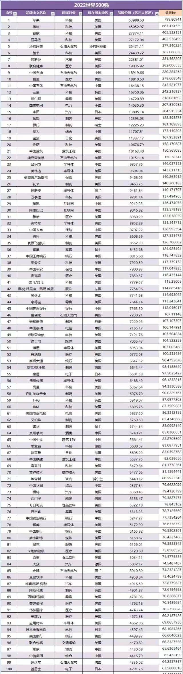 此次发布的2022世界品牌500强是首次由中国机构发布的该类榜单。区别于其他相关榜单几乎完全由国外机构主导,这次发布的榜单是首次由中国机构主导,中外专家协作,以中国视角、中外联合制定国际标准发布的全新榜单,对于中国品牌出海,中国品牌文化向海外传播具有开创性的意义。 2022世界品牌500强中,苹果、微软、谷歌位列前三。茅台成为2022世界品牌前100强中唯一一家酒类品牌,在食品饮料中排在前列的是可口可乐,以5322.18亿元的品牌价值排名第75位,百事则位于第83位。