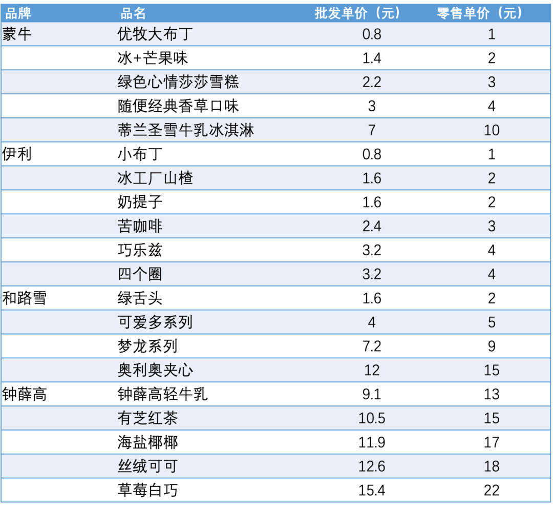 本土品牌方面,蒙牛、伊利、光明等企业掌控中端价格带的话语权;德氏、天冰等区域性老牌雪糕定位中低端。