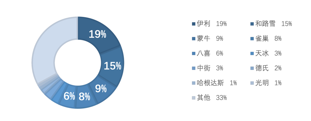 但《中国冰淇淋/雪糕行业趋势报告(2022版)》却显示,伊利、和路雪、蒙牛、雀巢4家雪糕/冰淇淋品牌线下冰淇淋市场份额分别达到19%、15%、9%和8%,合计达51%。