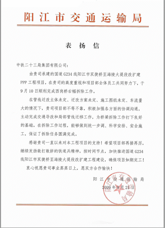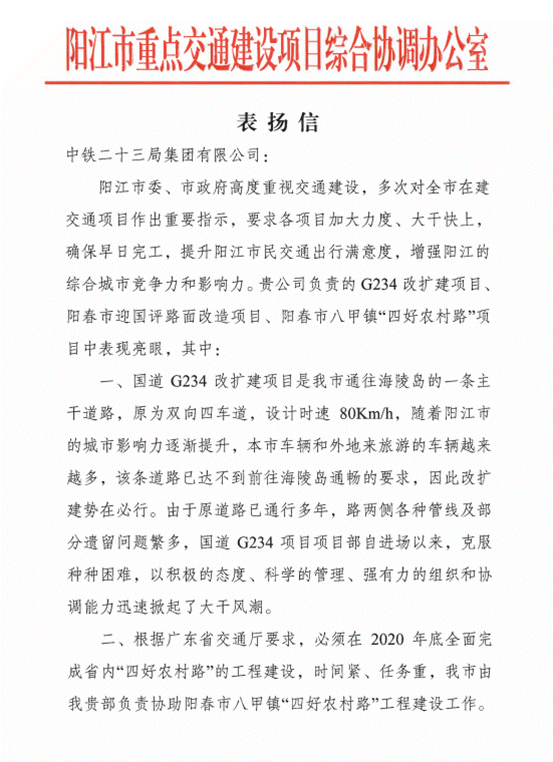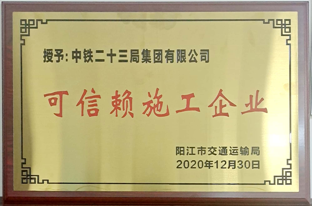 1、2020年12月,凭借国道G234项目中铁二十三局集团有限公司荣获阳江市交通局授予的“可信赖施工企业”。