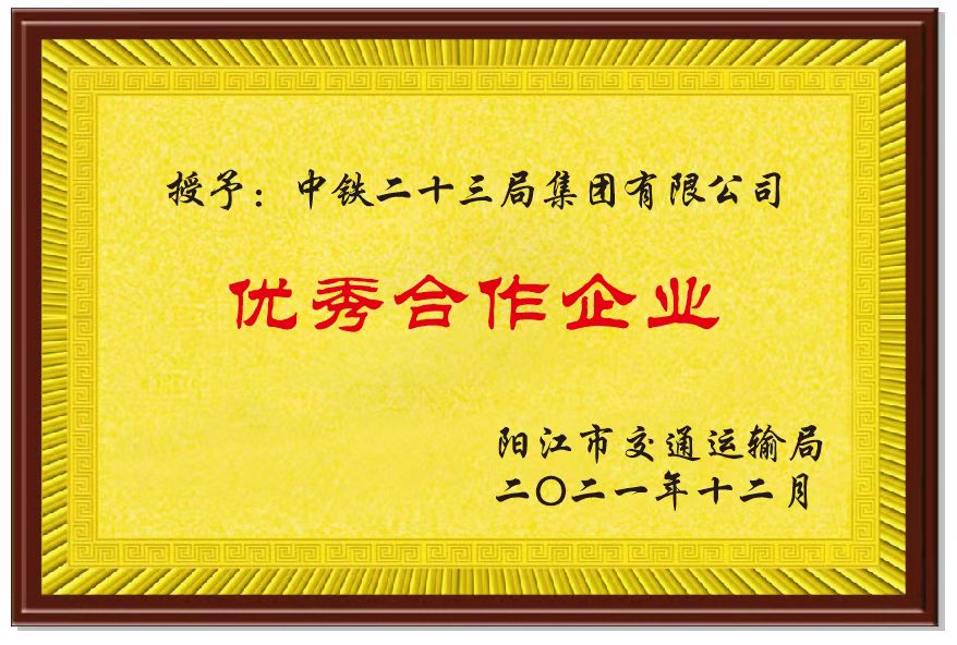 2、2021年12月,凭借国道G234项目中铁二十三局集团有限公司荣获阳江市交通局授予的“优秀合作企业”。