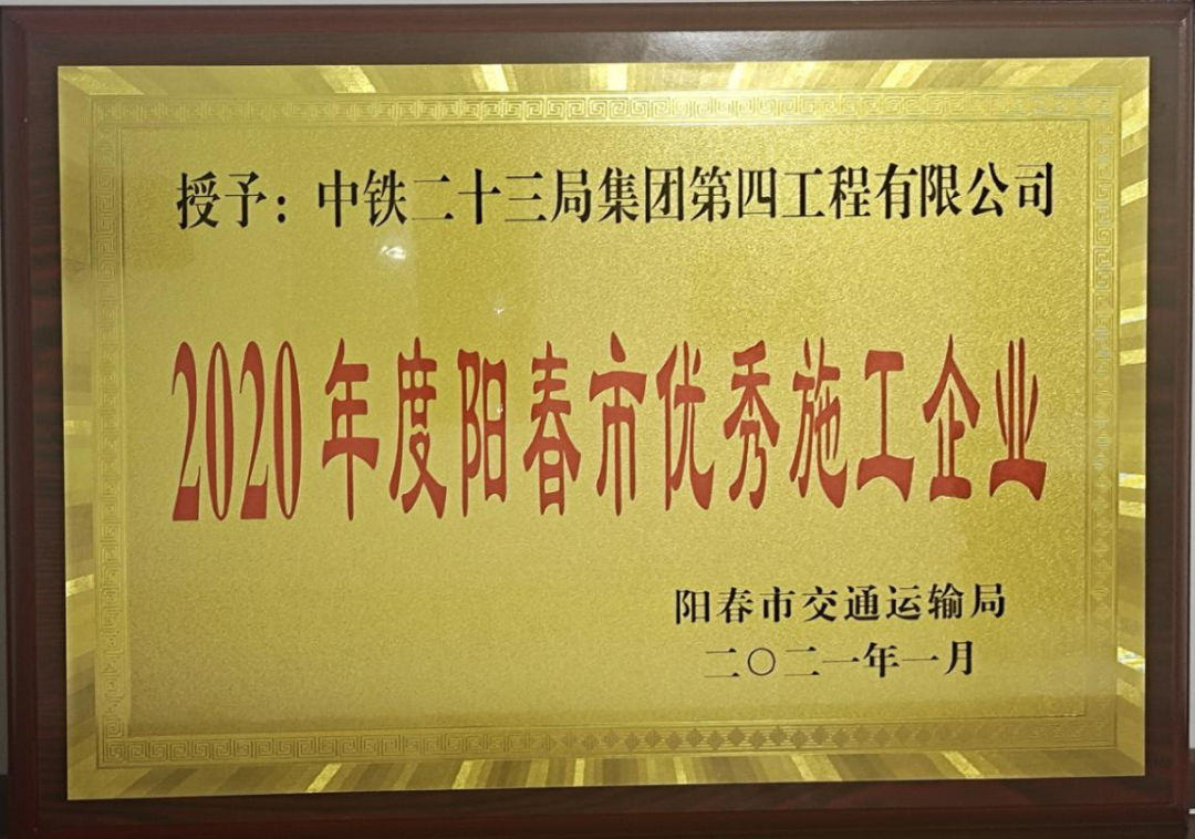1、2021年1月,凭借阳春八甲项目中铁二十三局集团第四工程有限公司荣获2020年度阳春市优秀施工企业。