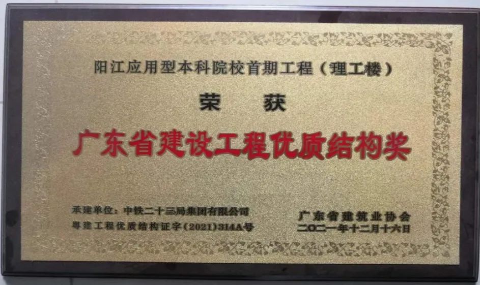 2、2021年12月,承建阳江应用型本科院校首期工程(理工楼)荣获“广东省建筑工程优质结构奖”。