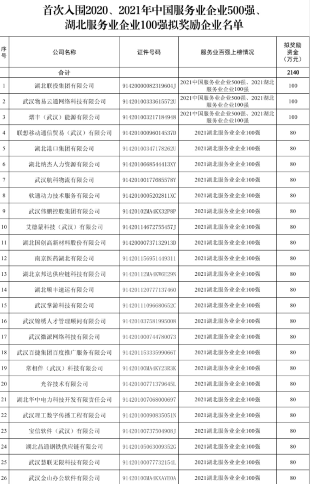 经审查,湖北联投集团有限公司等26家企业符合奖励条件。此次拟对湖北联投集团等4家企业分别奖励100万元,对联想移动通信贸易(武汉)有限公司等22家企业分别奖励80万元。
