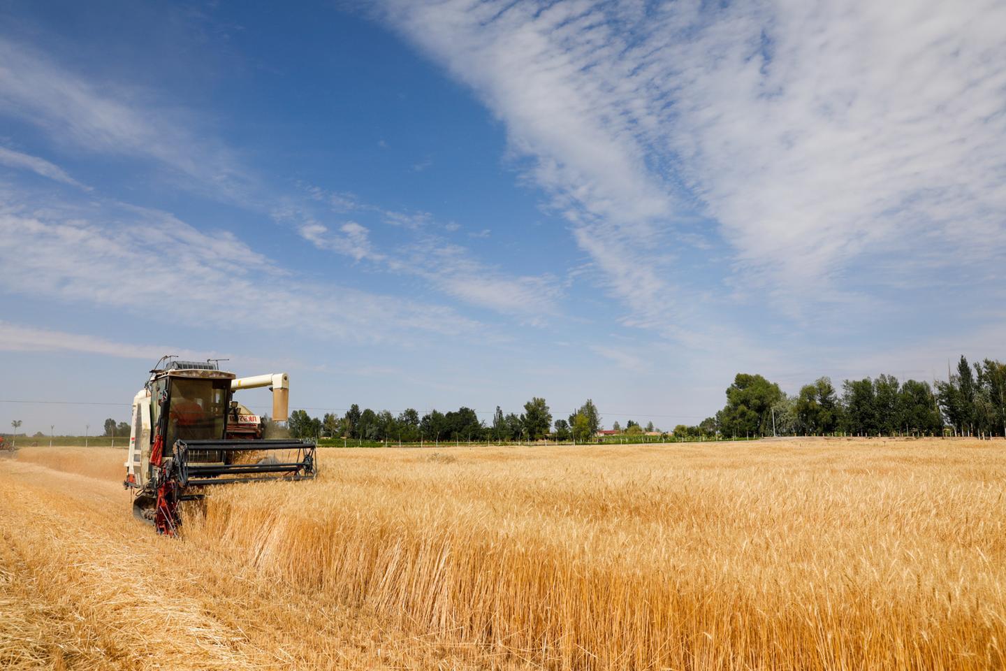 联合收割机正在收割小麦