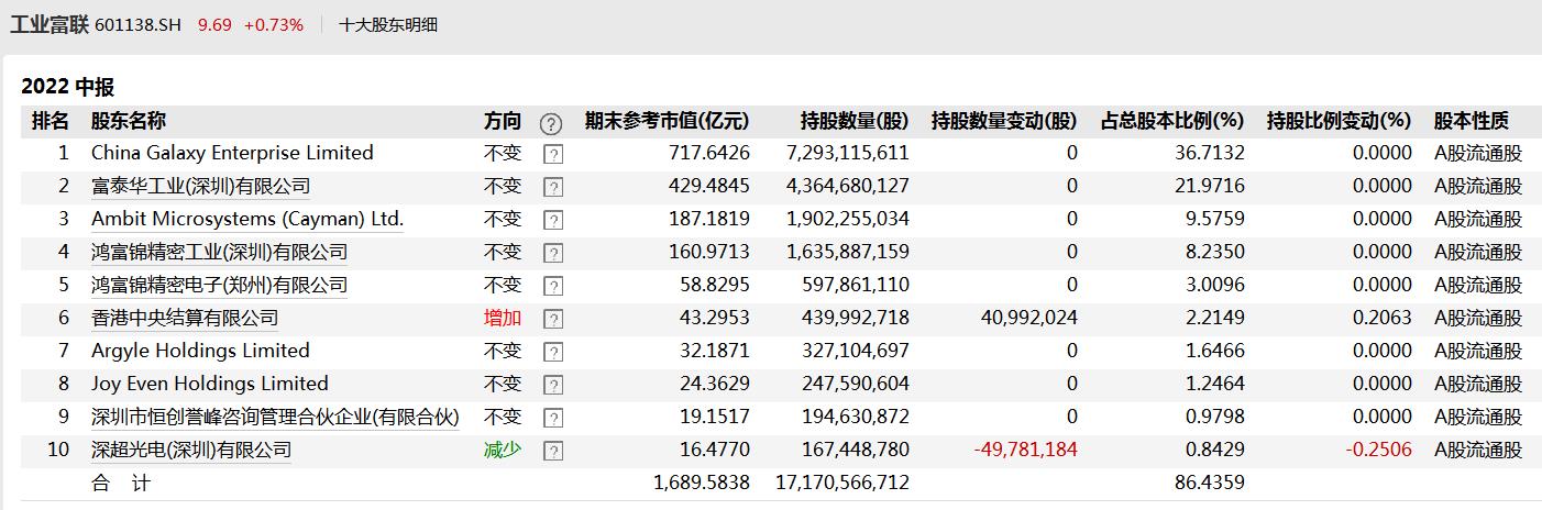 其中,香港中央结算有限公司(陆股通)持股数量有所增加,增持4099.20万股,增持后持股数量为43999.27万股,期末参考市值43.30亿元;深超光电(深圳)有限公司持股数量有所下降,减持4978.12万股,减持后持股数量为16744.88万股,期末参考市值16.48亿元。