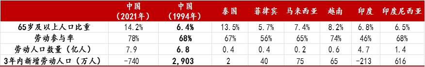 英美等发达国家已进入或正向超老龄化社会过渡,以东南亚六国为代表的发展中国家,其老龄化程度也高于1994年的中国(除菲律宾外)。从劳动人口数量衡量,越南等国家对我国形成的劳动人口替代量较小。印度作为人口大国,但劳动参与率不足50%,近10年来劳动人口仅增加1300万人,近3年劳动人口更出现了负增长。因此,我国当前面临的外部劳动人口替代效应明显弱于1994年的日本。