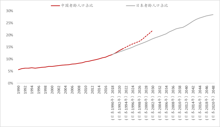 德国老龄人口(65岁及以上)占总人口的比重在1972年到达14%(所谓的进入深度老龄化社会),经过36年后,到2008年才突破20%,进入超老龄化阶段。日本从深度老龄化社会过渡到超老龄化社会(1994年-2006年),用时12年。与德国和日本相比,2021年我国65岁以上人口占比已达14.2%,正式进入深度老龄化社会。但我国的老龄化进程或许更快,按照当前出生及死亡水平推算,可能在2030年即过渡到超老龄化,用时才9年。