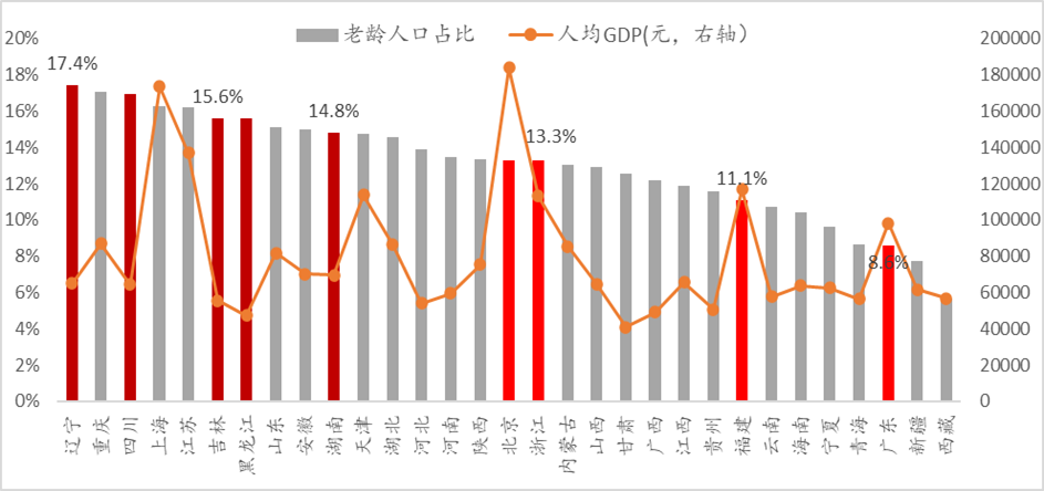 在老龄人口占比超过14%的12个省及直辖市中,辽宁、四川、吉林、黑龙江和湖南的人均GDP不足7000元。而经济大省中,北京和浙江的老龄化水平适中,福建和广东老龄化水平则相对较低。