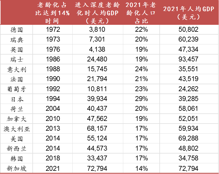 当这些高收入经济体在步入深度老龄化初期,人均GDP通常在3万美元(人均30000美元以上为步入发达经济体标准)左右,澳大利亚和新加坡甚至高达7万美元。而我国2021年人均GDP为1.2万美元,还是属于中等偏上收入国家,仍未跨入高收入经济体行列。