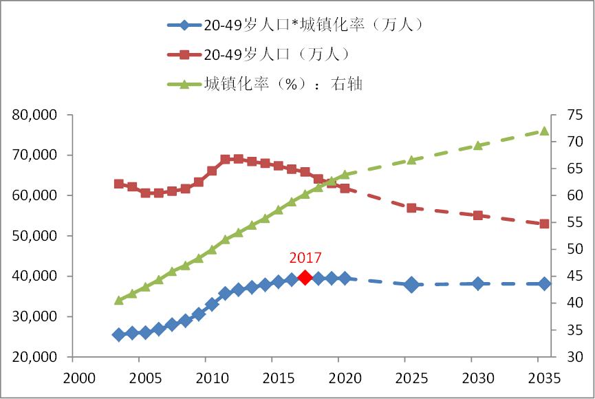 以我国劳动年龄(15-59岁)人口的统计口径,劳动年龄人口规模早在2011年左右都已经见到了高点。如果采用跟美国、日本更接近的统计口径,用20-49岁年轻人口乘以城镇化率,则在2017年已经见到高点。