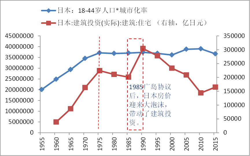 日本18-44岁的年轻人口乘以城市化率在1975年左右出现拐点,日本住宅建筑投资也同时出现拐点。