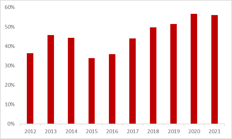 近年来,土地财政对地方经济的拉动作用明显,地方政府对房地产依赖度也在不断增加。从房地产行业税收和国有土地使用权出让数据估算,2015年至2020年间我国地方财政对房地产业依赖度从34%上升至57%,2021年依赖度略有回落但仍处于56%的高位。