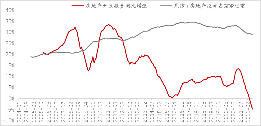 我国房地产开发投资增速于2011年开启下行周期。2016年起小幅回升后,于2021年下半年再次快速回落,目前进入负增长区间。房地产投资加基建投资在经济体量中占比也已在2017年底见顶。