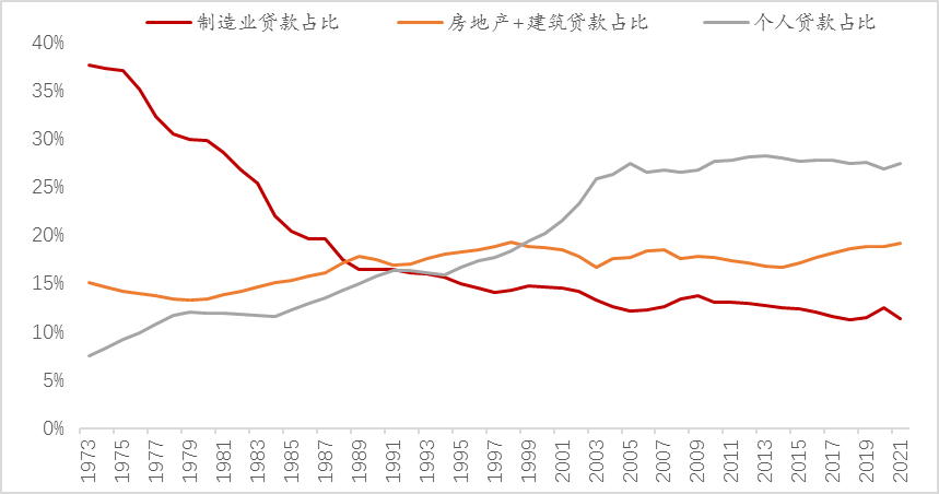 重化工业化时代基本结束:制造业融资需求减弱80年代日本经济增速换挡,实体经济对资金需求降低,股市的上涨又吸引了一部分企业转向资本市场融资。日本银行通过增加房地产和个人贷款规模来保证利润增长。大多数个人贷款担保是土地和房产,主银行制度下银行和房企又形成交叉持股,因此实际上日本银行对房地产业风险暴露在逐渐增加。