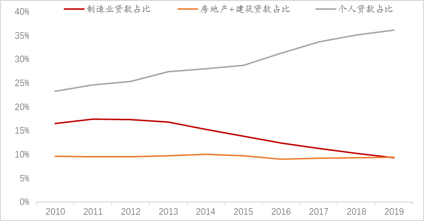 从上图中不难发现,我国的制造业贷款占比已经从2011年的17%回落至9%,这与我国经济增速的放缓完全一致,反映了我国从90年代初开始的工业化转型基本完成,事实上,2006年以后,我国的重化工业化进程就从峰值回落,三次产业中服务业的占比显著上升,制造业的占比开始下降。
