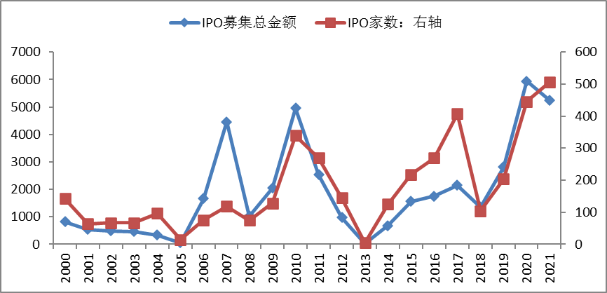 2006年以来,A股市值和流通市值稳步增加,总市值从2005年底的4万亿左右上升到目前接近100万亿元的水平。从IPO的家数和募集金额来看,过去受市场行情的影响较大,2010年推出创业板带来了IPO的一波小高潮,而在2018年底推出科创板以及注册制改革后,IPO的家数和募集金额双双创出新高。