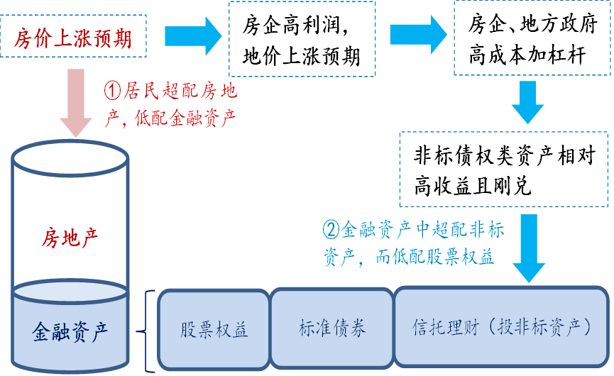 房地产预期的改变是促使居民财富配置转向的根本原因。一方面,房价上涨的预期会直接驱动居民超配房地产而低配金融类资产。另一方面,房价上涨的预期使得房企高利润和地价上涨的预期强,而这是房企和地方政府高成本加杠杆的主要促发因素。房价上涨预期打破,居民继续加配房地产的意愿下降,主要依附于房地产产业链和地方政府高成本加杠杆的非标资产也将大幅减少,且收益率下降和兑付风险上升。资金流入财富管理行业。