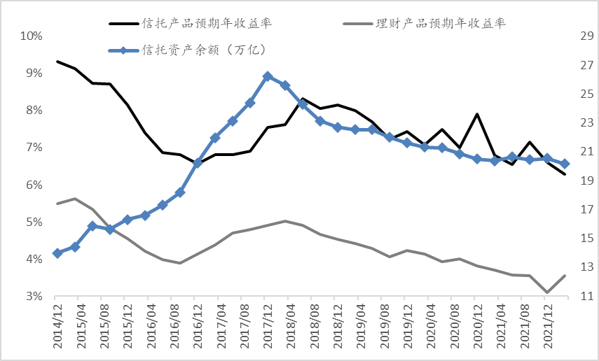 事实上,随着房地产预期的改变,以及资管新规的推出和地方政府举债行为的规范,信托、银行理财产品的收益率和规模都呈明显下降趋势。这是过去两年部分时段或部分公募基金和证券类私募基金产品募集火爆、规模迅速提升的重要原因。