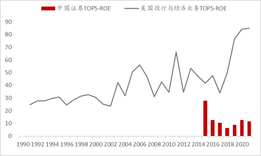 我国当前共有52家证券及期货公司上市,前5大公司市值集中度稳定在36%左右;美股市场共有93家投行及经纪公司上市,前5大市值集中度稳定在50%左右。我国证券行业商业模式同质化严重,头部公司综合实力差异不大,小型券商生存空间承压,ROE分布左侧长尾现象明显。美国投行及经纪公司的经营模式相对分化,头部形成高盛、花旗、摩根斯坦利等全能性投行,全球业务线齐全;中小型投行则向专业化和特色化经营方向发展,形成了有独特竞争力的精品化或区域性投行。