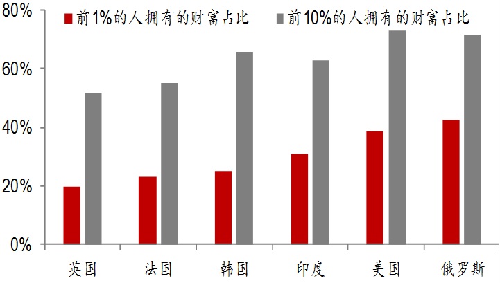 全球经济经历了二战至今的发展,经济结构扭曲和居民财富分化问题,已经成为一个全球性的问题。根据Piketty 和 Saez的测算,主要经济体中,财富前1%的居民,持有的财富占社会总财富的比重都在20%以上,其中俄罗斯高达43%,美国高达39%,印度31%;前10%的居民持有的财富占比都在50%以上,其中俄罗斯、美国都在70%以上,韩国、印度也都在60%以上。