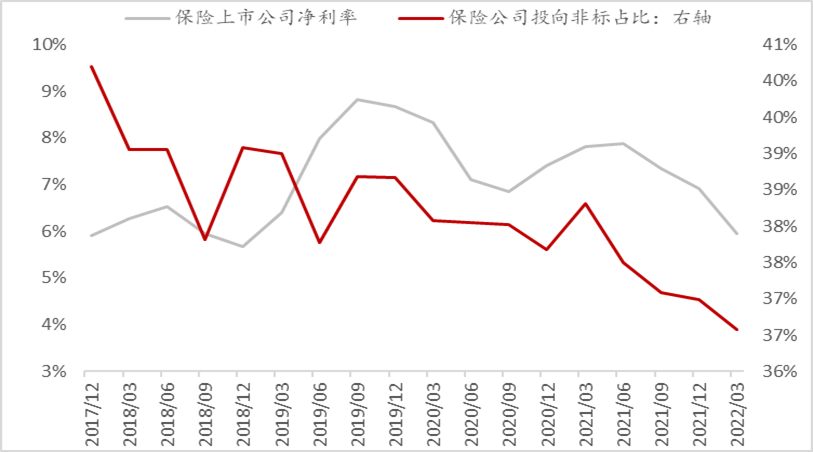 保险公司盈利模式的实质为赚取利差。其收入端为保险公司实际投资收益率,成本端为保险资金成本。由于保费规模的约束,资金成本存在较强的刚性,因此投资收益率在直接决定着保险公司的盈利状况。资管新规及房地产下行周期开启的影响下,保险公司投向非标占比快速收缩,高回报低风险的优质资产减少,保险公司利润承压。中长期来看,保险公司利润水平提升有赖于权益与固收+产品市场的稳健发展。