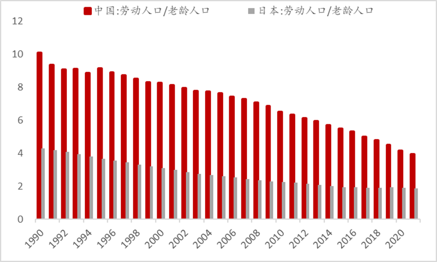1994年日本进入深度老龄化时,我国正处于劳动力快速增长时期,十年间(1994年-2004年)劳动人口从6.8亿增长至7.6亿。而当前的中国尽管进入深度老龄化阶段,但面对的是一个普遍迈向老龄化的世界,故劳动力数量还是全球第一,尽管2022年我国总人口将被印度超越。但2021年我国仍有7.9亿劳动力,而印度只有4.7亿劳动力。