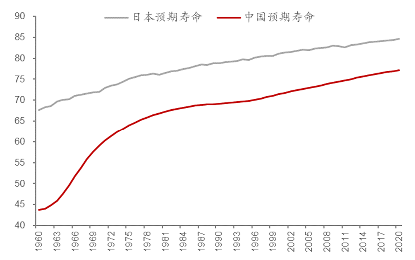 一方面,我国面临更快的新生人口下降。2021年我国新出生人口1062万人,相比2016年竟然下滑40%,而1994年的日本出生人口仅较5年前下降0.7%。另一方面,我国预期寿命仍处于快速提升阶段。叠加庞大的人口基数,老年人口快速增长带来的冲击更加明显。