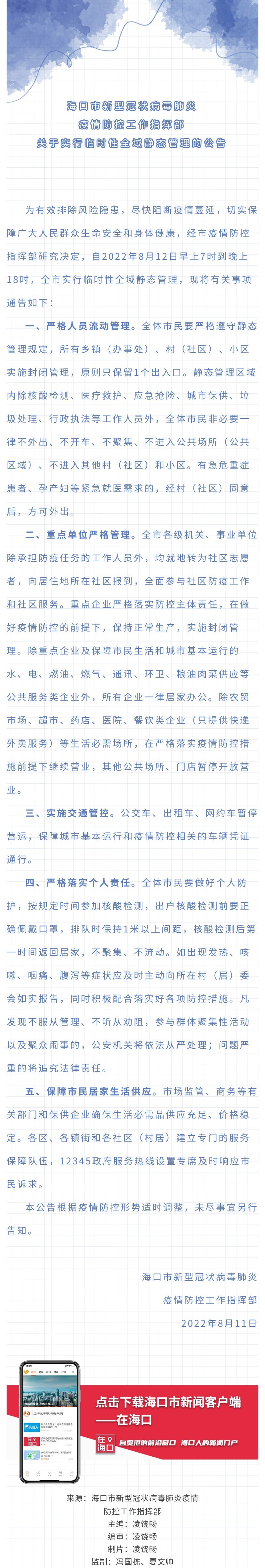 海口发布关于8月12日实行临时性全域静态管理的公告
