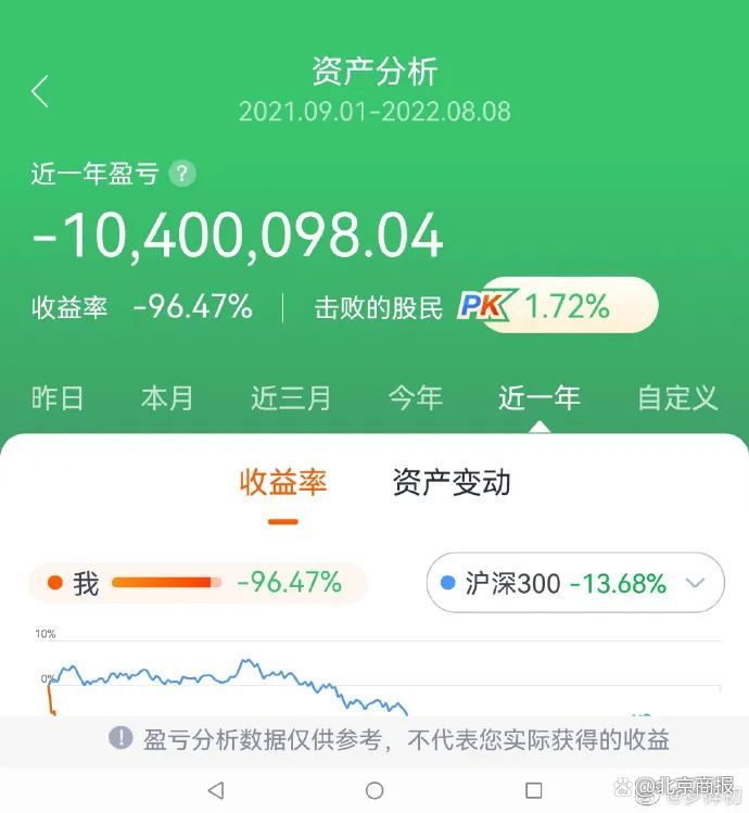 根据上述网友晒出的收益截图,最近一年(2021年9月1日至2022年8月8日)其个人资产亏损高达96%,亏损金额高达1040万元。同期沪深300指数跌幅为13.68%。