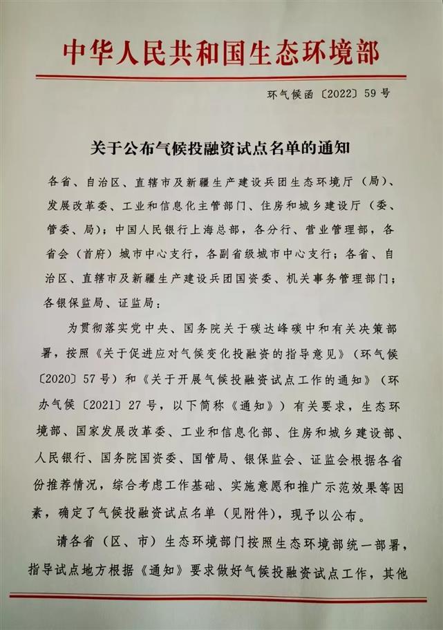 据丽水市生态环境局发布的信息,日前生态环境部、国家发改委、工业和信息化部、住建部、人民银行、银保监会、证监会、国资委、国管局九部委联合公布了气候投融资试点名单,丽水市作为浙江省唯一参选城市成功入选。据了解,气候投融资是指为实现碳达峰碳中和目标,引导和促进更多资金投向应对气候变化领域的投资和融资活动,是绿色金融的重要组成部分。接下来,丽水将围绕“实现一个总体目标,制定一套指标体系,开展八大重点任务”的工作体系,使资金、人才、技术等各类要素资源进一步向气候投融资领域充分聚集,不断摸索、创新、总结,逐步形成一套可复制、可推广的模式,助力全省、全国实现“双碳目标”。(浙江之声记者徐鹏飞)