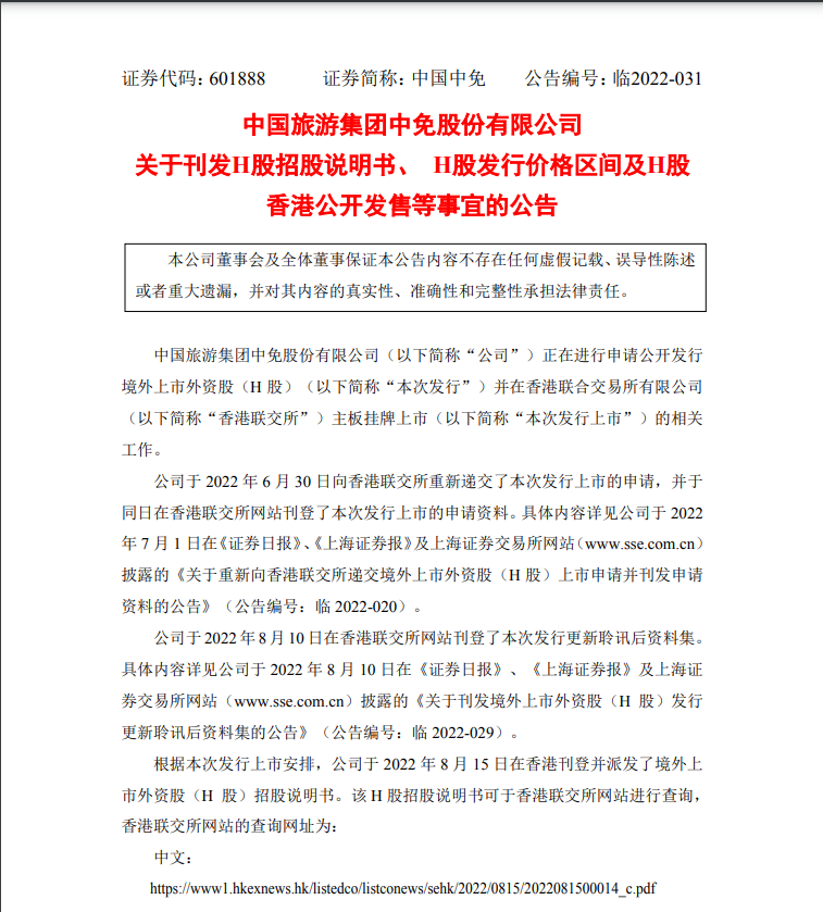相关资料显示,2021年6月,中免首次向港交所递交了上市申请书,同年11月22日通过港交所上市聆讯;不过,其后中免宣布由于受疫情影响,全球资本市场低迷,暂缓赴港上市进程。今年,中免重新启动赴港上市;6月30日,中免再度向港交所递交上市申请书,拟以“A+H”形式在港上市。