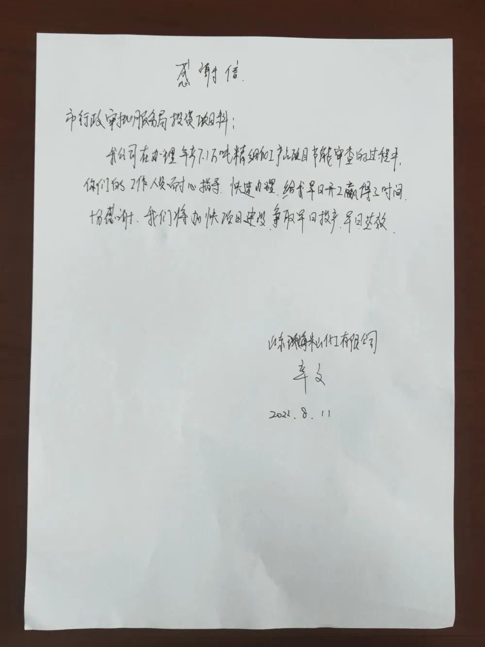 “我公司在办理年产7.1万吨精细化工产品项目节能审查过程中,你们的工作人员耐心指导、快速办理,为我们早日开工赢得了时间,十分感谢!我们将加快项目建设,争取早日投产达效。”近日,一封来自山东瑞海米山化工有限公司的感谢信送到了市行政审批服务局,对投资项目科工作人员在项目节能审查手续办理中给予的倾心帮助表示感谢。