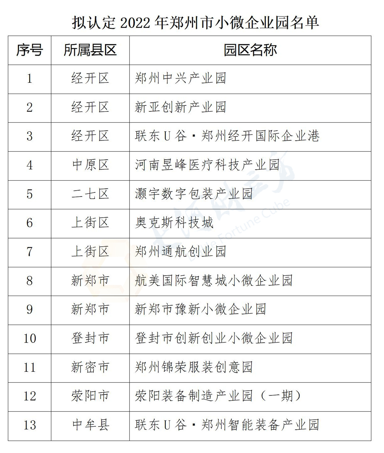 【大河财立方消息】8月17日,郑州市工业和信息化局公示2022年拟认定小微企业园名单。根据相关文件要求,经园区申报、区县(市)初审推荐、专家评审,拟认定郑州中兴产业园、新亚创新产业园等13家小微企业园。