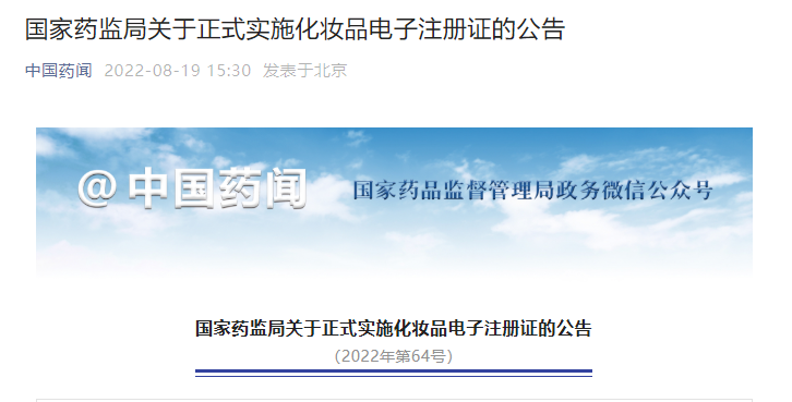 8月19日,国家药监局发布正式实施化妆品电子注册证的公告。公告指出:为贯彻落实党中央、国务院关于深化“放管服”改革的重要决策部署,依据《中华人民共和国电子签名法》《全国一体化在线政务服务平台电子证照管理办法(试行)》《国家药品监督管理局电子证照管理办法(试行)》等,现就正式实施化妆品电子注册证有关事项公告如下: